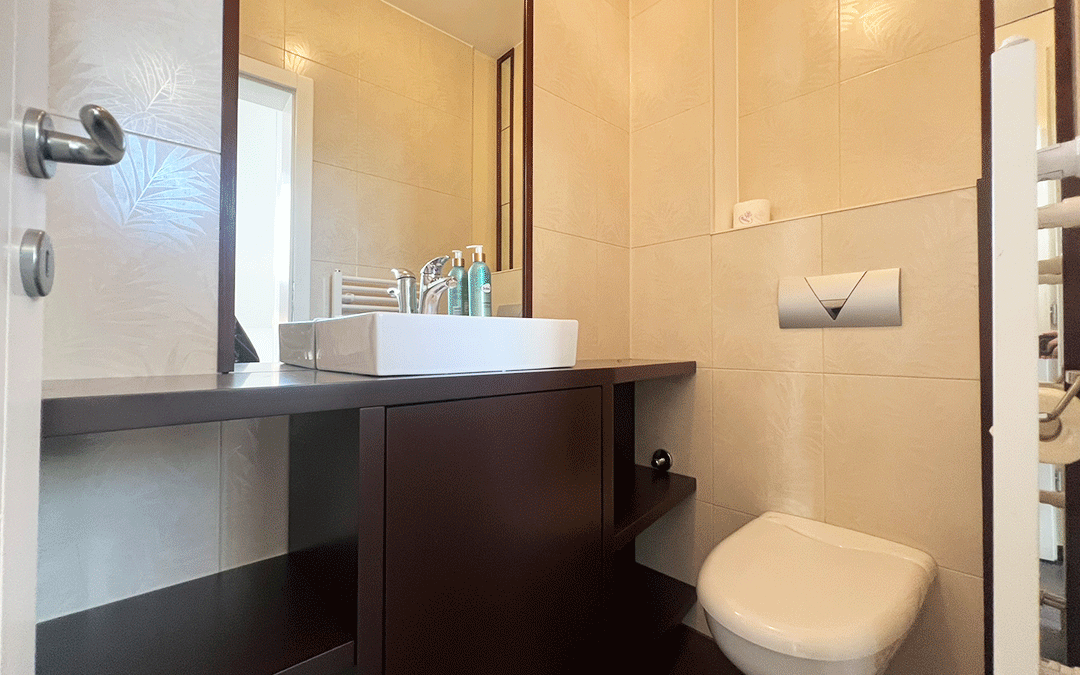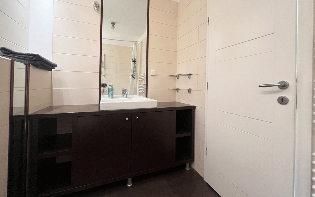 The apartment is situated in a small residential building with only two units, providing privacy and a pleasant, elevated position with a lovely panoramic city view.