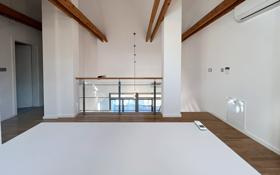 The first level features a spacious living room with access to a large balcony, a dining area, and a kitchen, while the gallery offers a bright and comfortable workspace. The apartment includes two bedrooms, plus an additional room that can be used as a third bedroom or as an extension of the living area.
