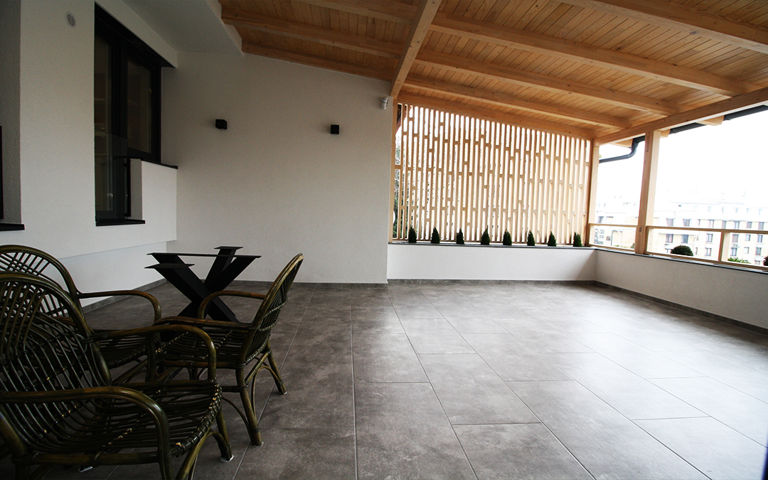 Prvi sprat: prostrani dnevni boravak, odvojena kuhinja sa trpezarijom, kupatilo i velika natkrivena terasa