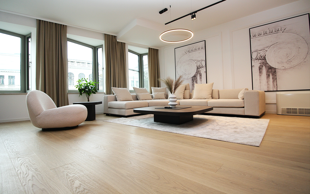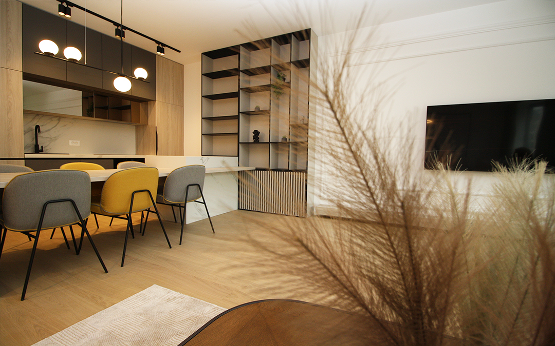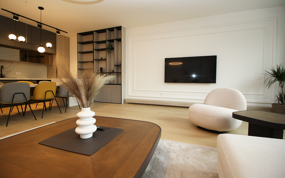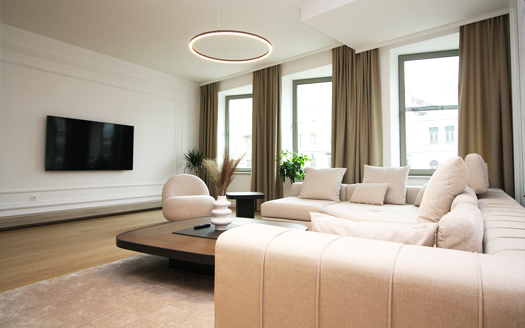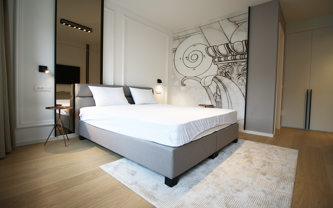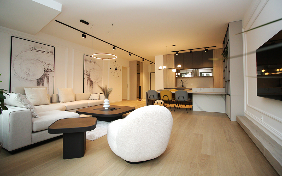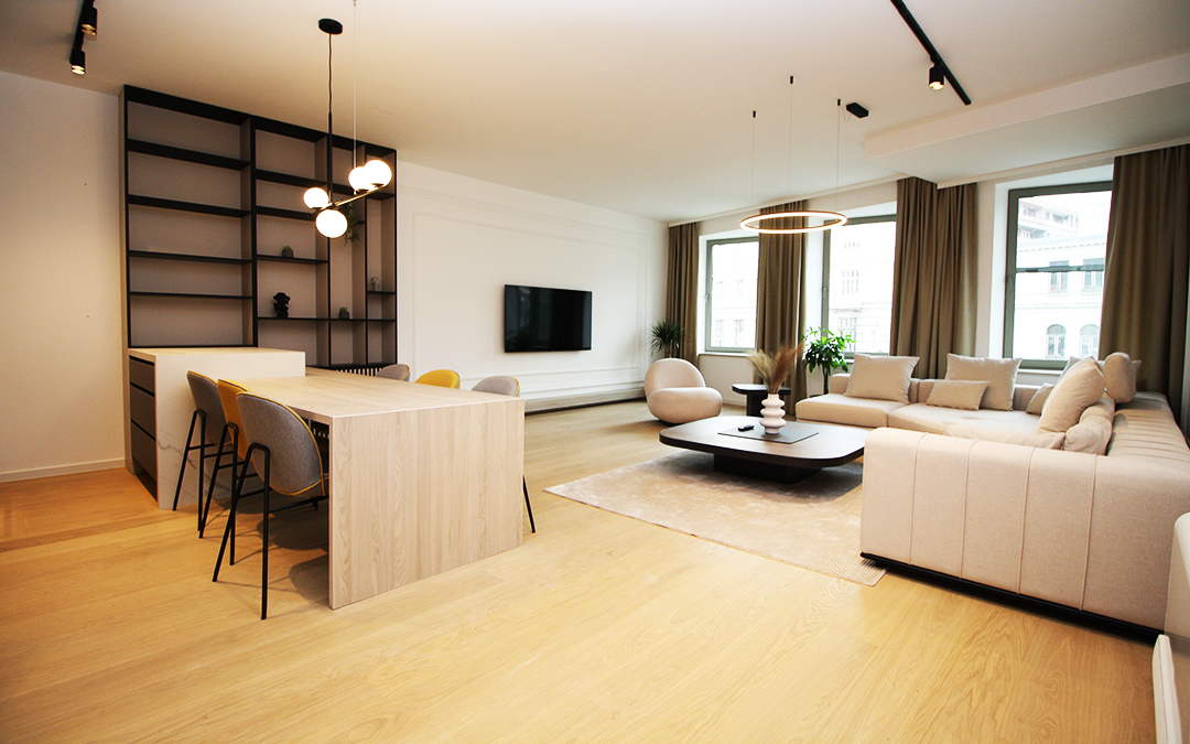 Kompletan stan je uradjen prema projektu poznate arhitektonske kuće i opremljen vrhunskim namještajem.