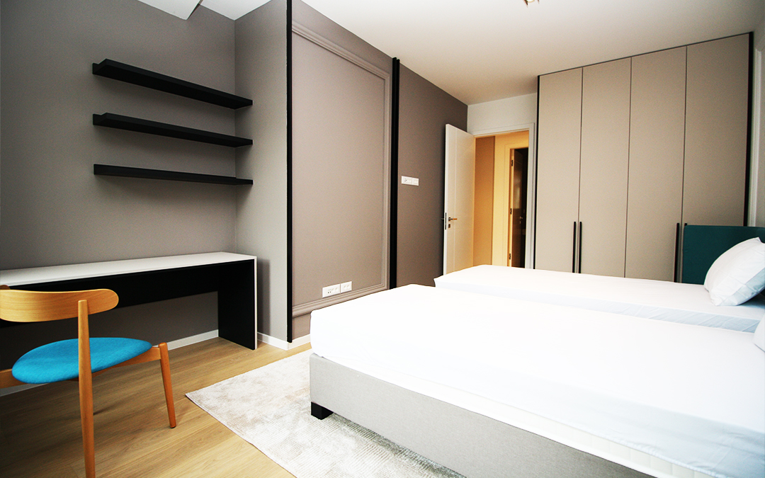 Ovaj izuzetan stan sastoji se od dnevnog boravka otvorenog plana trpezarije i kuhinja, tri spavace sobe i dva kupatila.